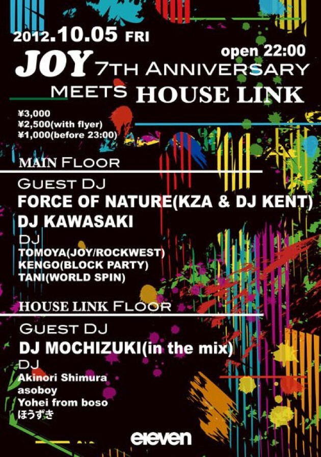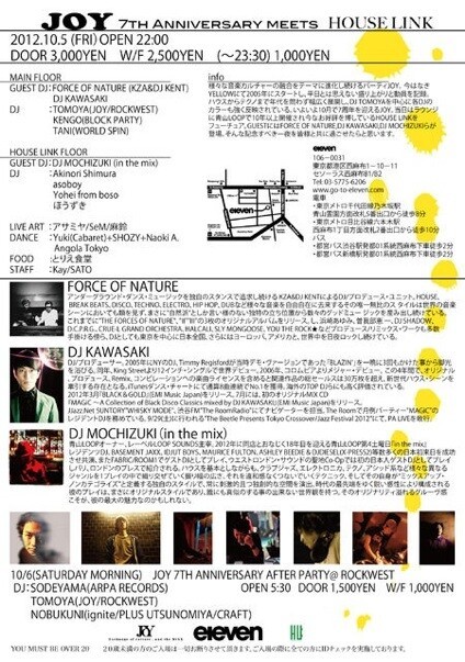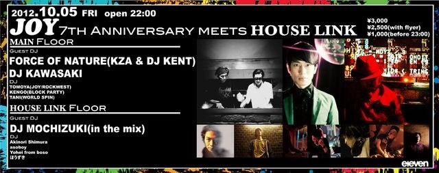 様々な音楽カルチャーの融合をテーマに進化し続けるパーティJOY。 今はなきYELLOWにて2005年にスタートし、平日とは思えない盛り上がりと動員を記録。ハウスからテクノまで年代を問わず幅広く展開し、DJ TOMOYAを中心に各DJのカラーも強く反映されている。いよいよ10月で7周年を迎えるJOY。当日はラウンジに青山LOOPで10年以上開催され今なお好評を博しているHOUSE LINKをフィーチュア。ゲストにはFORCE OF NATURE,DJ KAWASAKI,DJ MOCHIZUKIらが登場。そんな記念すべき一夜を皆様と共に過ごせたらと思います。