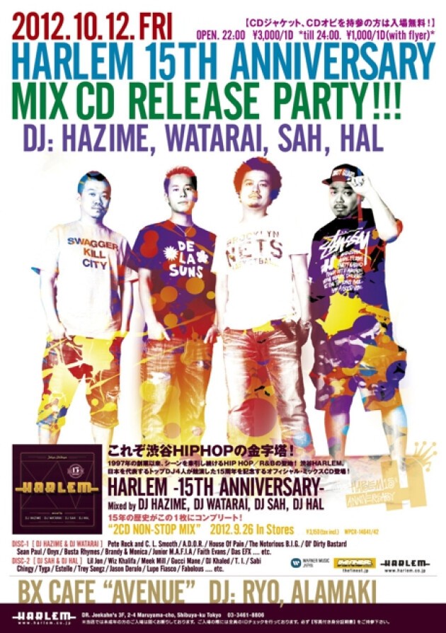 9/26にWARNER MUSIC JAPANより世に出た『HARLEM 15th ANNIVERSARY MIX CD』の発売を祝して、10/12.FRI に盛大にRELEASE PARTYを開催 !!!
