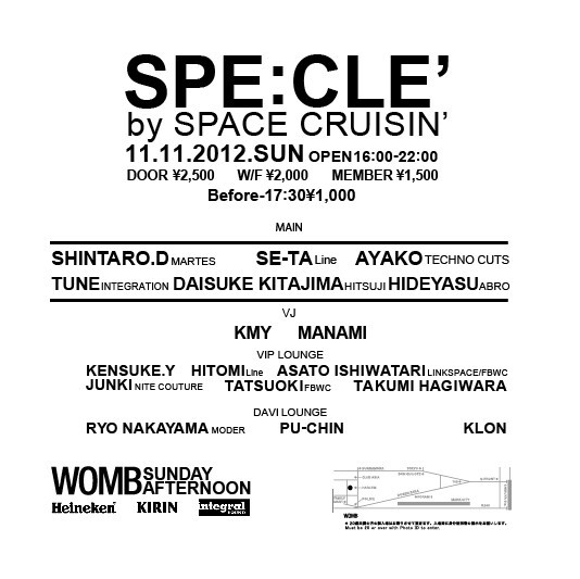 世界最高水準を誇るベニュー、WOMB にていち早く日曜の午後というパーティースタイルを提案し展開し、今ここに新たにリニューアルを果たした SPE:CLE' by SPACE CRUSIIN' のディープな音楽と映像を是非とも体感してほしい。