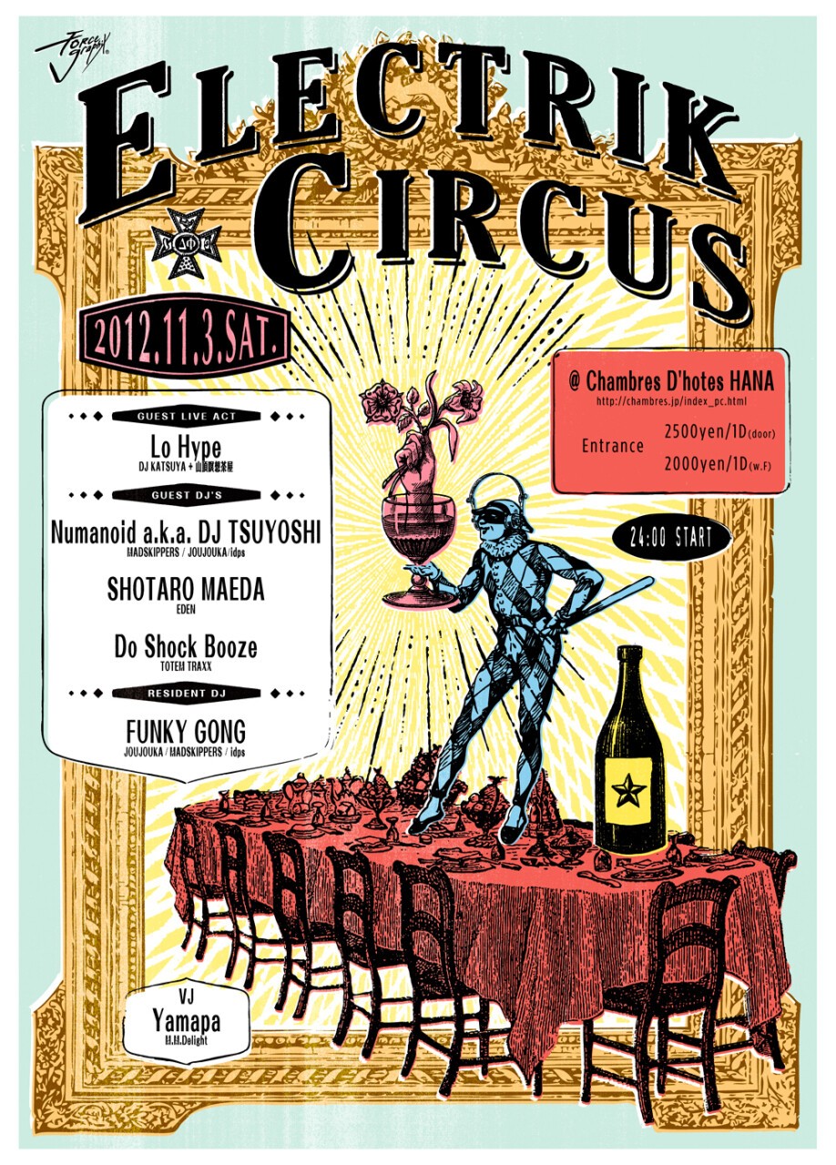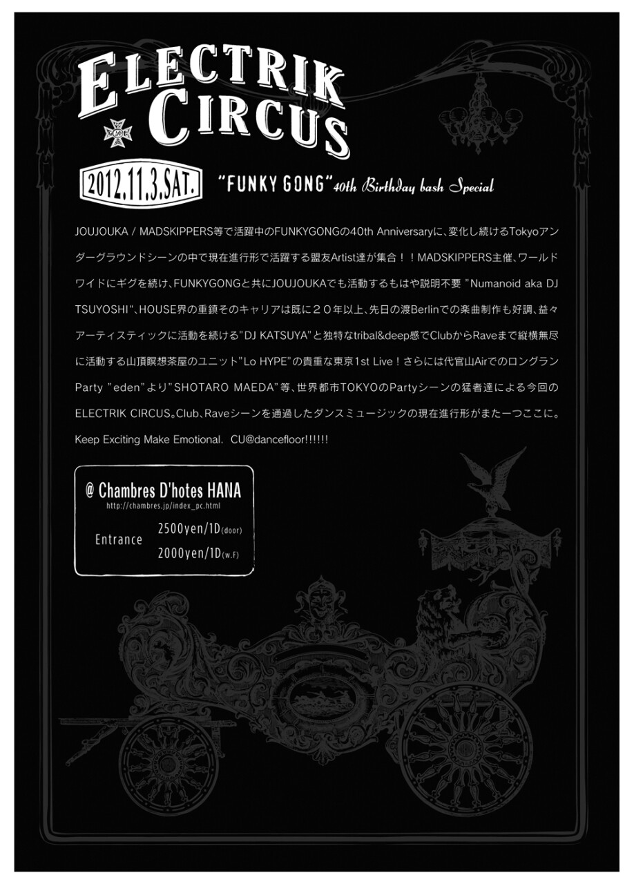 JOUJOUKA/MADSKIPPERS等で活躍中のFUNKYGONGの40thAnnivasaryに、変化し続けるTokyoアンダーグラウンドシーンの中で現在進行形で活躍する盟友Artist達が集合!!MADSKIPPERS主催、ワールドワイドにギグを続け、FUNKYGONGと共にJOUJOUKAでも活動するもはや説明不要『Numanoid aka DJ TSUYOSHI』、HOUSE界の重鎮そのキャリアは既に20年以上、先日の渡Berlinでの楽曲制作も好調、益々アーティスティックに活動を続けるDJ KATSUYA&独特なtribal&deep感でclubからraveまで縦横無尽に活動する山頂瞑想茶屋のユニット『Lo HYPE』の貴重な東京1stLive!!!さらには代官山Airでのロングランparty”eden”より『SHOTARO MAEDA』等、世界都市TOKYOのpartyシーンの猛者達による今回のELECTRIKCIRCUS。CLUB、RAVEシーンを通過したダンスミュージックの現在進行形がまた一つここに。Keep Exciting Make Emotional. CU@dancefloor!!!!!!