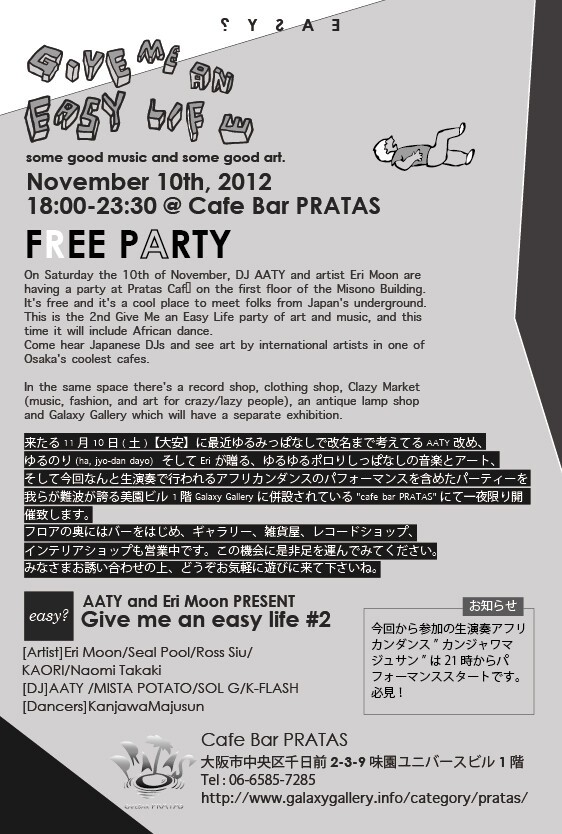 It's free and it's a cool place to meet folks from Japan's underground. This is the 2nd Give Me an Easy Life party of art and music, and this time it will include African dance.
