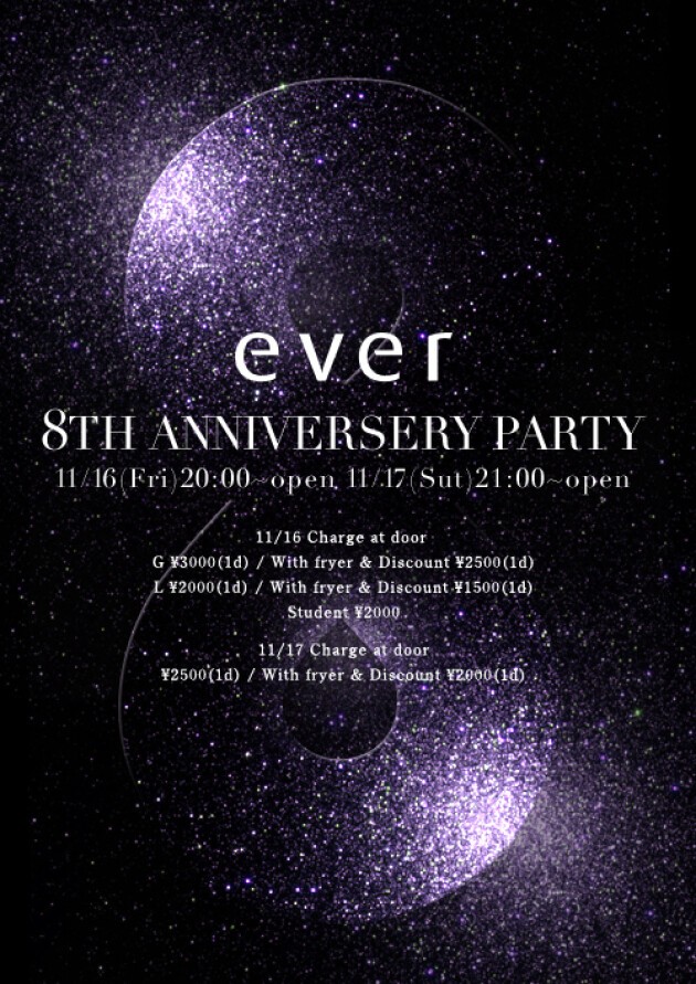 青山everのオープン8周年アニバーサリーを祝う為に、everとも親交の深い人気DJsが 一同に集結!ノベルティグッズや協賛企業からの”おみやげ”他、 STARTから0時まではフリーフードも豊富にご用意するなど内容盛りだくさんで皆様をお待ちしています。
