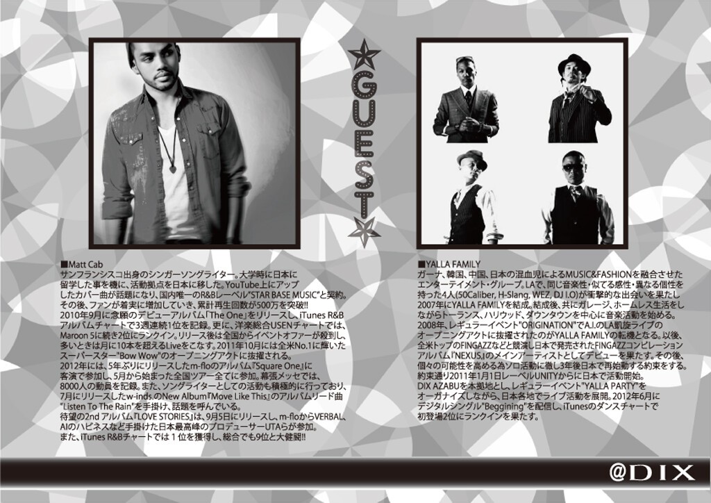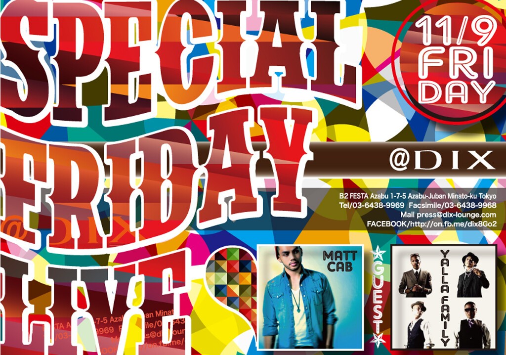 『DIX SPECIAL FRIDAY』GUESTにMATT CAB, Yalla Familyを迎え、Special Showcaseの他、RESIDENT DJのT & BULLによるALL MIXサウンドでお届けします。昨年10月に全米No.1に輝いたスーパースターBow Wowのオープニングアクトに抜擢された他、m-floのアルバム『Square One』に客演で参加するなど実力派シンガーMatt Cabのスペシャルライブをお見逃しなく!