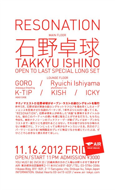 昨年5月、石野卓球が渾身の超ロングセットでフロアを埋め尽くしたオーディエンスを狂喜させた伝説のパーティが、1年半ぶりにAIRへ還ってくる。“RESONATION”。石野卓球本人が命名した“共振”を意味するタイトルからも、彼のこのパーティへの想いを感じ取ることができるだろう。もちろん今回も、東京テクノシーンのゴッドファーザーが紡ぐプレイはオープンからラストまで一度たりとも途切れることはない。それは他ではなかなか味わえない体験だけに、ファンにっとっては希少なチャンスといえる。先日のアニバーサリーにおける1時間限定のプレイに物足りなさを感じていた人は、ぜひここで心おきなく燃え尽きてほしい。