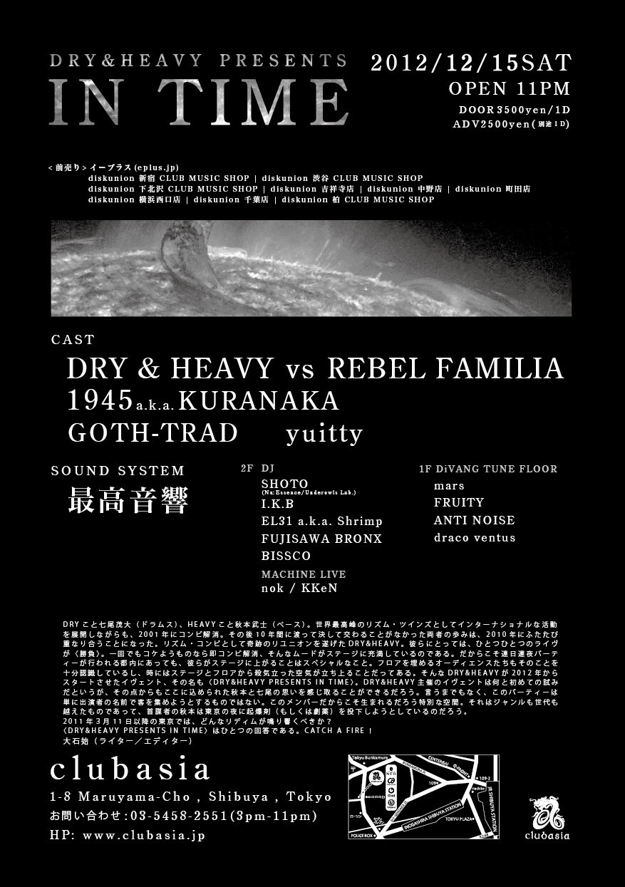そんなDRY&HEAVYが2012年からスタートさせたイヴェント、その名も〈DRY&HEAVY PRESENTS IN TIME〉。DRY&HEAVY主催のイヴェントは何と初めての試みだというが、その点からもここに込められた秋本と七尾の思いを感じ取ることができるだろう。言うまでもなく、このパーティーは単に出演者の名前で客を集めようとするものではない。このメンバーだからこそ生まれるだろう特別な空間。それはジャンルも世代も越えたものであって、首謀者の秋本は東京の夜に起爆剤(もしくは劇薬)を投下しようとしているのだろう。