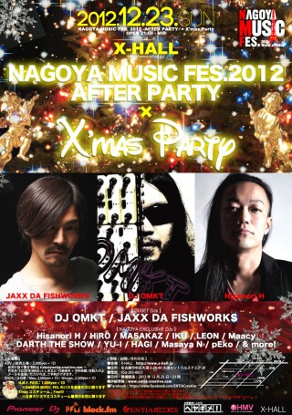 当日PM21:00よりX-HALLにて『NAGOYA MUSIC FES.2012 AFTER PARTY & X-HALL X'mas Party』の開催が決定!!!出演陣にはトラックメーカー、プログラマー、アレンジャー、プロデューサーとして活躍し、"Ableton Live Workshop"にて講師を勤めた「DJ OMKT」、世界No.1ダンスミュージックブランド「Ministry of Sound」との専属契約を交わし、正式にMinistry of Soundプロジェクトで活動をスタートさせた「JAXX DA FISHWORKS」!そして名古屋からは日本最大級のエンター テイメント・スペース"ageHa"の看板Party『House Dream』でARENA Floor Resident DJとして活躍中の「Hisanori H」をはじめ"N.M.F.アフターパーティ"にふさわしい超豪華DJ陣が参加!