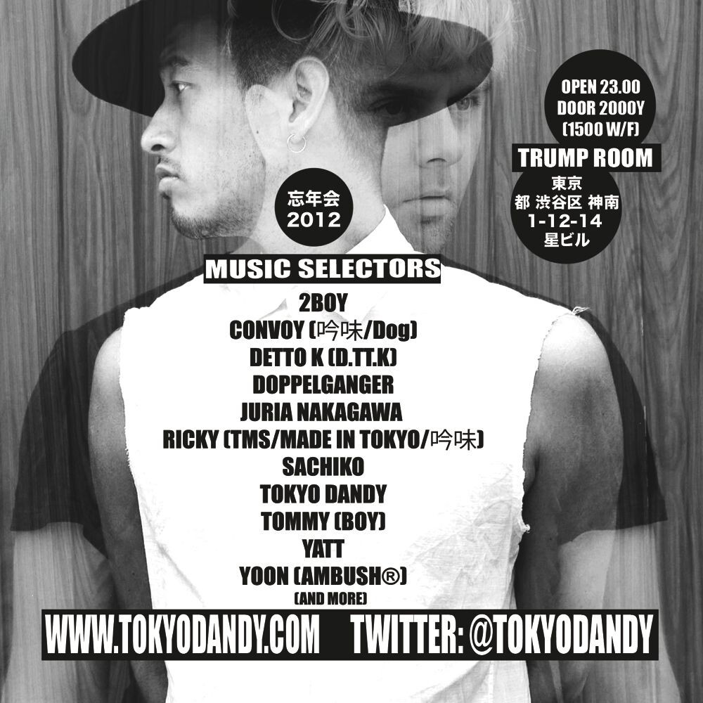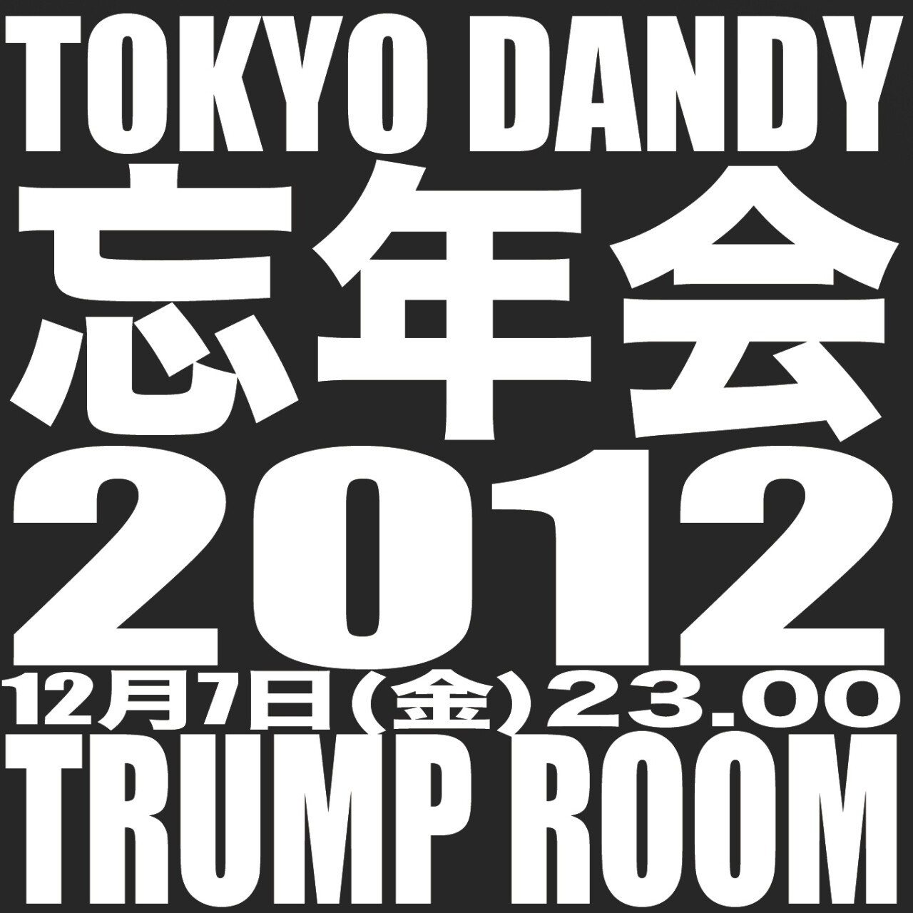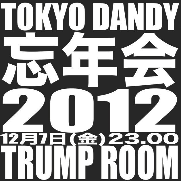 行事ごとの多いこの季節。2012年12月7日(金)渋谷TRUMP ROOMにて「TOKYODANDY 忘年会 2012」を開催。お世話になった人たちとあの場所(トランプルーム)で騒ごうではないか。DJ陣には東京のアイコンたちが集結。乞うご期待!