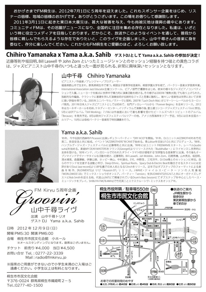 地元桐生出身のジャズピアニスト 山中千尋をメインに、ゲストDJとして YAMA a.k.a. SAHIB の参加!