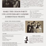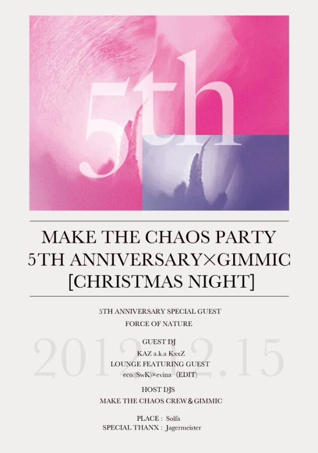 CHAOSが5周年を迎えるにあたってANNIVESARTY PARTYを開催することが決定!そしてその5周年と同時期にCHRISTMAS NIGHTを行う音楽に”仕掛け”をほどこし、世の音楽好きの心を鷲掴みにし、HAPPYな空間を提供するPARTYことGIMMICとの前回、記録的な熱狂ぶりを見せた二度目のコラボが実現に。そしてそのコラボイベントのSPECIAL GUESTとして日本を代表するDJ/ProducerユニットとしてシーンをリードしてきたFORCE OF NATUREの参戦が決定!またGUESTにはミドル世代を代表するDJ/OrganizerのKAZ a.k.a KxxZ、LOUNGE のFEATURING GUESTにはイカしたPARTYを都内で行っているeco.(SwK)×evina(EDIT)とMAKE THE CHAOS PARTYと同じ時期を過ごした同年代周りでスクラムを組んだ間違いない布陣に。また協賛にはJagermeisterが付き、そしてこの日のためだけに考えられた中目黒SolfaオリジナルDRINKを格安で提供などDRUNKな部分も抜かりなし。底抜けのHAPPY感、CHAOS感を5年分ギュッと凝縮し、それに最高