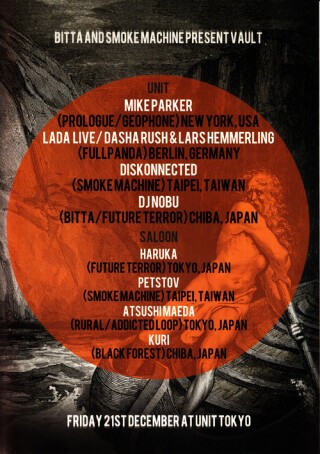第一回目となる12/21(金)は、NYの鬼才MIKE PARKER(DJ)と、ロシアの才媛DASHA RUSHとベルリンのLARS HEMMERLINGによるユニット"LADA"(LIVE)をゲストに迎え、日本からDJ NOBU, KURI, HARUKA, ATSUSHI MAEDAの4人、台湾からDISKONNECTED, PETSTOVの2人というラインナップで臨む。