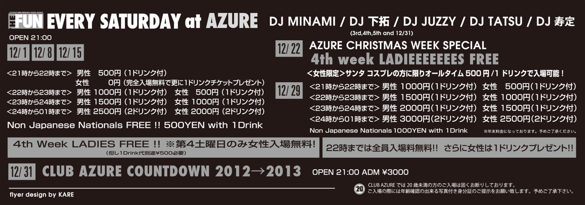 知らない人は無し、大阪いち有名なこの場所この曜日この時間。SOUL FOOD、SATURDAY AZUREに続く、毎週土曜日の新定番パーティー『THE FUN』が、2011年10月より始動!DJ MINAMI & DJ 下拓の、揺るぎないツートップは勿論、アーリータイムから、HipHopを中心にR&BやReggae、また近年のチャートを賑わすダンスチューンなど幅広い選曲が楽しめます!関西クラブ遊びの登竜門とも言える『土曜日のアズール』には、本当に色んな人が遊びに来ており、毎週来ても新たな音楽・お酒・友達と出会える、チェック必至のパーティーです!出会いの秘訣は、何より“楽しむ”こと!週末土曜日の夜を素敵なものにしたいパーリーピーポー達よ!JUST HAVE FUN!!