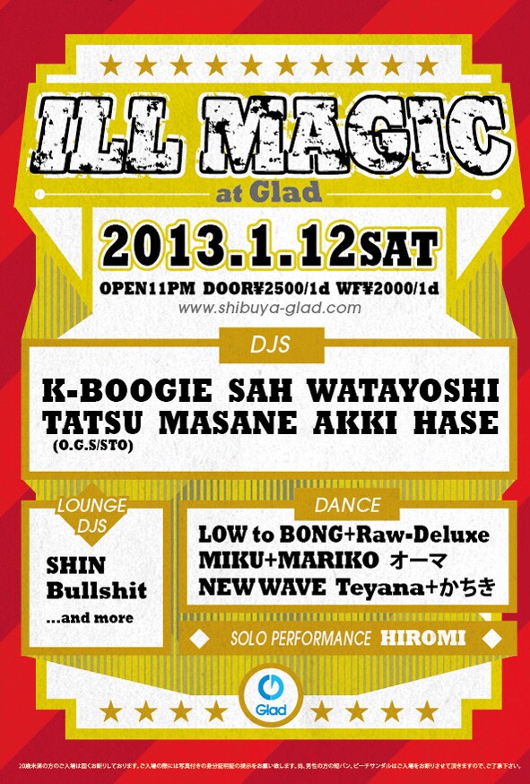 90'sイベントの中で泥臭くなくスタイリッシュになイベントととして、好評を博していた良質なイベント“ILL MAGIC”がGladにて復活!この日は、来日が決定している元D.I.T.C、O.CのAFTER PARTYも兼ての開催!現在のシーンに失われつつある、音への探求心が詰まった極上のPARTYです!HIPHOP黄金期を今、体験できるのはこの日を逃すと中々ないはず。是非!