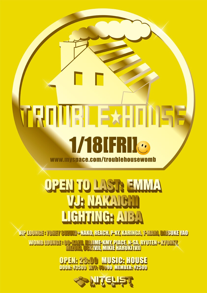 昨年、華々しく9周年を迎え10周年に向かってスタートを切った、音楽と照明そして映像のコラボレーションというテーマから生まれた EMMA による WOMB マンスリーレジデントパーティー TROUBLE HOUSE。EMMA が毎回オープンからラストまで渾身のロングプレイを披露ライティングは既に EMMA のプレイには欠かせない存在となっている盟友 AIBA、ビジュアルは YOSHIAKI NAKAICHI が担当している。9年以上、毎月回を重ねて培ってきた息のあったプレイはこのパーティーでしか体感出来ない素晴らしい空間を作り出している。最新情報は TROUBLE HOUSE フェイスブックをチェック!いいねを押してね。