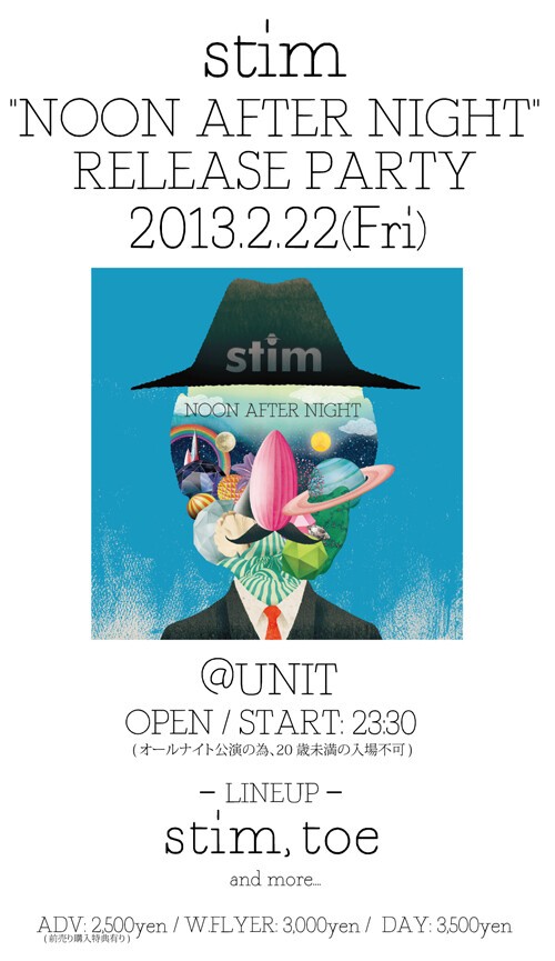 結成10周年にして初の全国流通となった2ndアルバム"NOON AFTER NIGHT"のリリースパーティーが2/22にUNIT/SALOONにて行われる。そんな夜を祝う共演者には、深夜への登場が珍しい盟友toeが既に決定。わー!!!メインアクトはまだ強者が参戦予定とかしないとか。。。SALOONを賑わすDJ陣も多種多才。。。情報は随時更新予定、ジャンルとかへったくれも無い最高のメンツでstimをお祝いしましょう、お祝いに来てね、乾杯しようぜー!