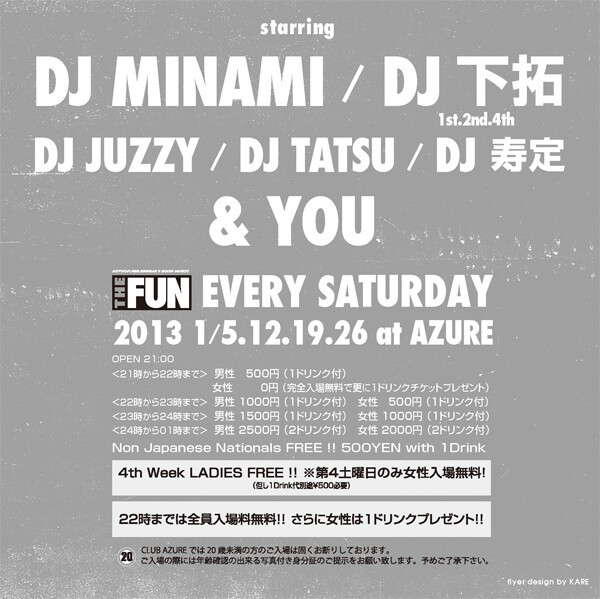 知らない人は無し、大阪いち有名なこの場所この曜日この時間。SOUL FOOD、SATURDAY AZUREに続く、毎週土曜日の新定番パーティー『THE FUN』が、2011年10月より始動!DJ MINAMI & DJ 下拓の、揺るぎないツートップは勿論、アーリータイムから、HipHopを中心にR&BやReggae、また近年のチャートを賑わすダンスチューンなど幅広い選曲が楽しめます!関西クラブ遊びの登竜門とも言える『土曜日のアズール』には、本当に色んな人が遊びに来ており、毎週来ても新たな音楽・お酒・友達と出会える、チェック必至のパーティーです!出会いの秘訣は、何より“楽しむ”こと!週末土曜日の夜を素敵なものにしたいパーリーピーポー達よ!JUST HAVE FUN!!