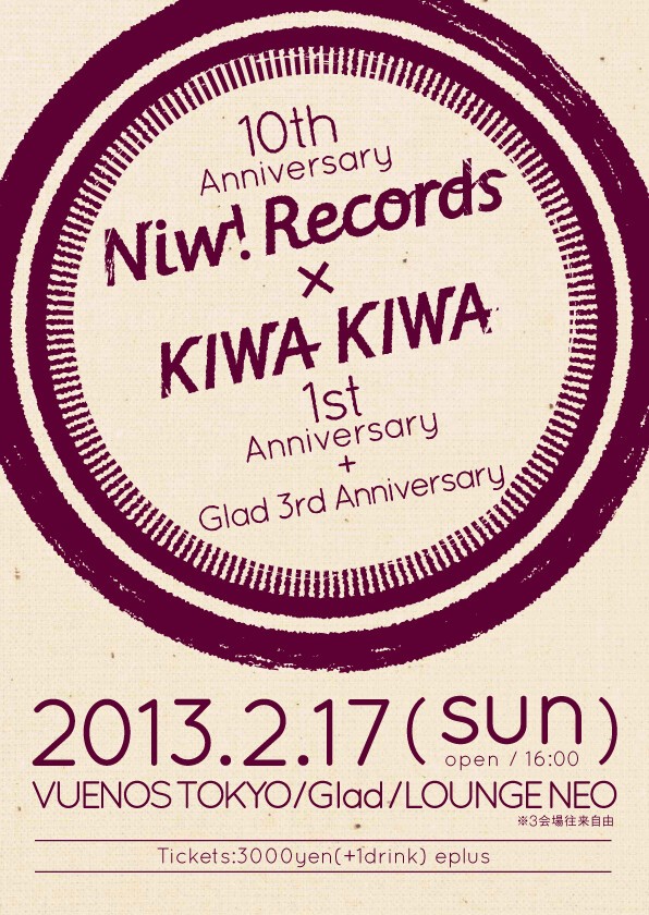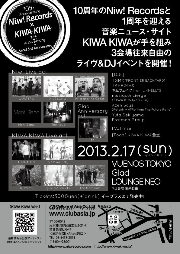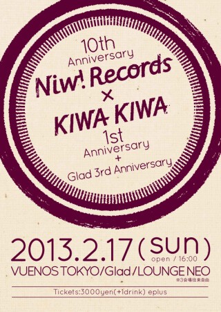 10周年YEARのNiw! Recordsと、1周年を迎える音楽ニュース・サイトKIWA KIWAが手を組み、3会場往来自由のライヴ&DJイベントを開催!