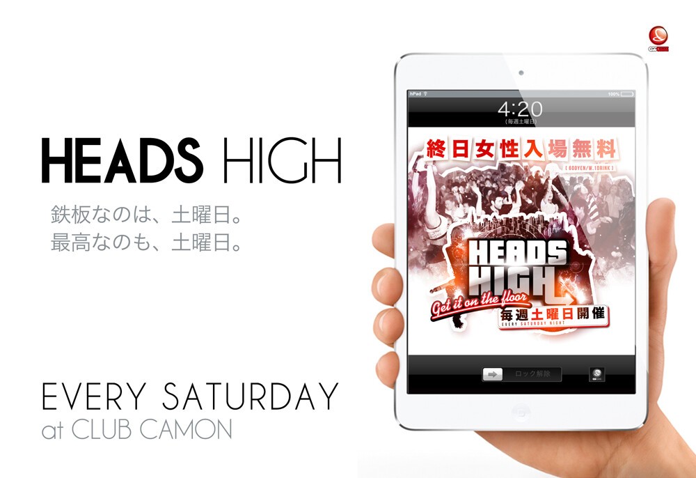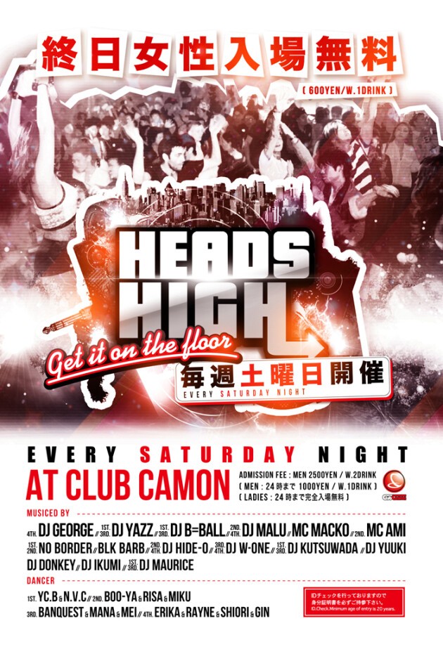 毎週土曜カモンは関西を代表するアーティストによるビッグパーティー『HEADS HIGH』♪関西を代表する超豪華なDJ陣が毎週ローテーションで登場!!ジャンルは幅広い選曲で最初から最後まで楽しめます☆HIP HOP, R&B, REGGAE, ELECTRO, TOP40など♪土曜でも女性は終日入場無料なので安心して遊びに来て下さい★★