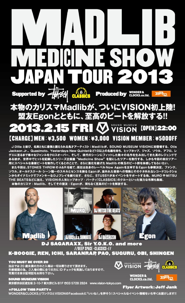 J Dillaと並び、名実ともに最強と讃えられる鬼才アーティスト:Madlibが、SOUND MUSEUM VISIONに初登場する。Otis Jackson Jr.、Quasimoto、Yesterdays New Quintet、など10以上の名義を持ち、ヒップホップ、ジャズ、ソウル、アフロ、レゲエに至るまで様々なジャンルをクロスオーバー。そして、現代のシーンにフィットした数々の名作を生み出してきた真のレジェンドである彼が、世界中でヒットを記録したシリーズ企画盤”Medicine Show”を冠にしたツアーを敢行する。しかも今回の来日ツアー用にスペシャルな最新ビートを制作してくるとのことで、さらに進化を遂げたMadlibの珠玉のビート群を体感してもらいたい。