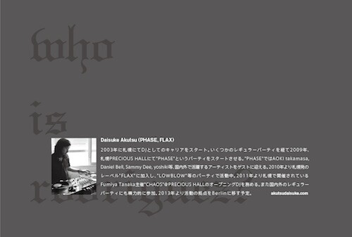 2003年に札幌にてDJとしてのキャリアをスタート。いくつかのレギュラーパーティを経て2009年、札幌PRECIOUS HALLにて"PHASE"というパーティをスタートさせる。 "PHASE"ではAOKI takamasa, Daniel Bell, Sammy Dee, yoshiki等、国内外で活躍するアーティストをゲストに迎える。 2010年より札幌発のレーベル"FLAX"に加入し、"LOWBLOW"等のパーティで活動中。 2011年より札幌で開催されているTanaka Fumiya主催"CHAOS"@PRECIOUS HALLのオープニングDJを務める。また国内外のレギュラーパーティにも精力的に参加。 2013年より活動の拠点をBerlinに移す予定。