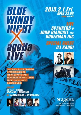 ageHa史上最強のALL MIXパーティー、“PINK Fridays”が 2013年“ageHa LIVE”として復活!第一回目は“BLUE WINDY NIGHT”とのスペシャル・コラボレーション。ゲストとして「セックス・オン・ザ・ビーチ」でおなじみのSPANKERSと「新世代を代表するヒップホップ・アクト」DOBERMAN INCがライブを披露!更にNo.1フィーメールDJ、DJ KAORIも登場!