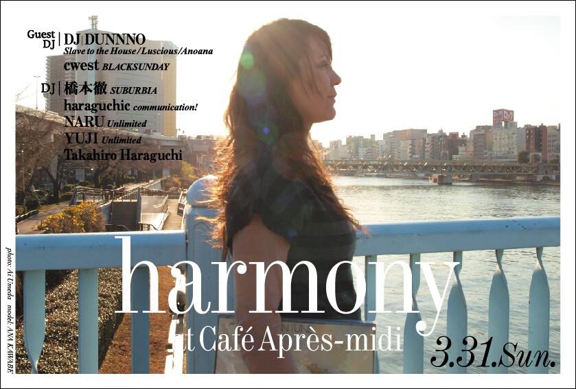 2月2日に代官山・AIRを代表するハウス・パーティー「groundrhythm」へ参加するなど、何かに護られるかのように好調な「harmony」ですが、引き続き、2月22日には西麻布・eleven「DJ EMMA with Dazzle Drums」ラウンジにもharmony DJsが登場。支えてくださっているみなさんのおかげです。その勢いそのままに、第23回は、さらなる深化をめざします。ゲストDJに、「Slave to the House」主宰DJ DUNNNO、そして「BLACKSUNDAY」主宰cwest。叫びと悲しみ、救済と鎮魂、宇宙と孤独。その先にある、グルーヴ。3月だからこその音楽を届けられたら。ぜひ遊びにいらしてください。