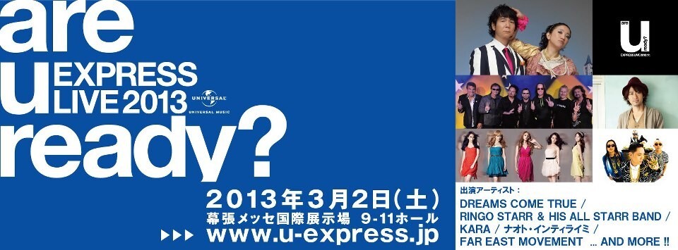 ユニバーサル ミュージック主宰のライヴイベント「U-EXPRESS LIVE 2013」にRINGO STARR & HIS ALL STARR BAND、DREAMS COME TRUE、KARA、ナオト・インティライミ、FAR EAST MOVEMENTが出演決定。