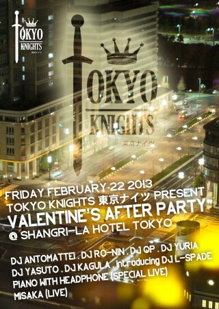 Welcome to the first TOKYO KNIGHTS 東京ナイツ event of 2013 where we celebrate Valentine's Day in luxury and style. If you didn't find love before come check our dance floor on the 27 floor of the 5-star Michelin awarded Shangri-La Hotel at Tokyo Station. Possibly you can find love here at the "Valentine's After Party" along with good music.