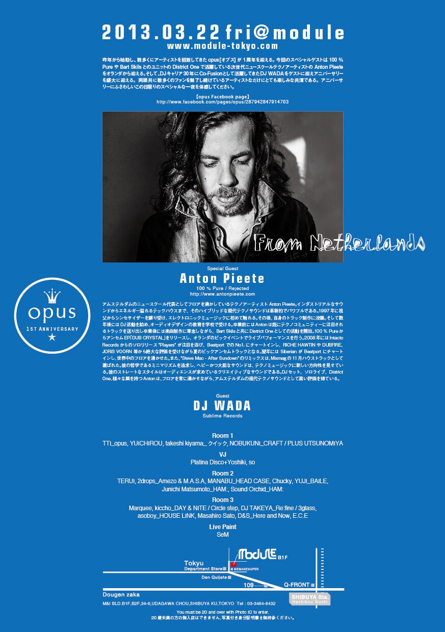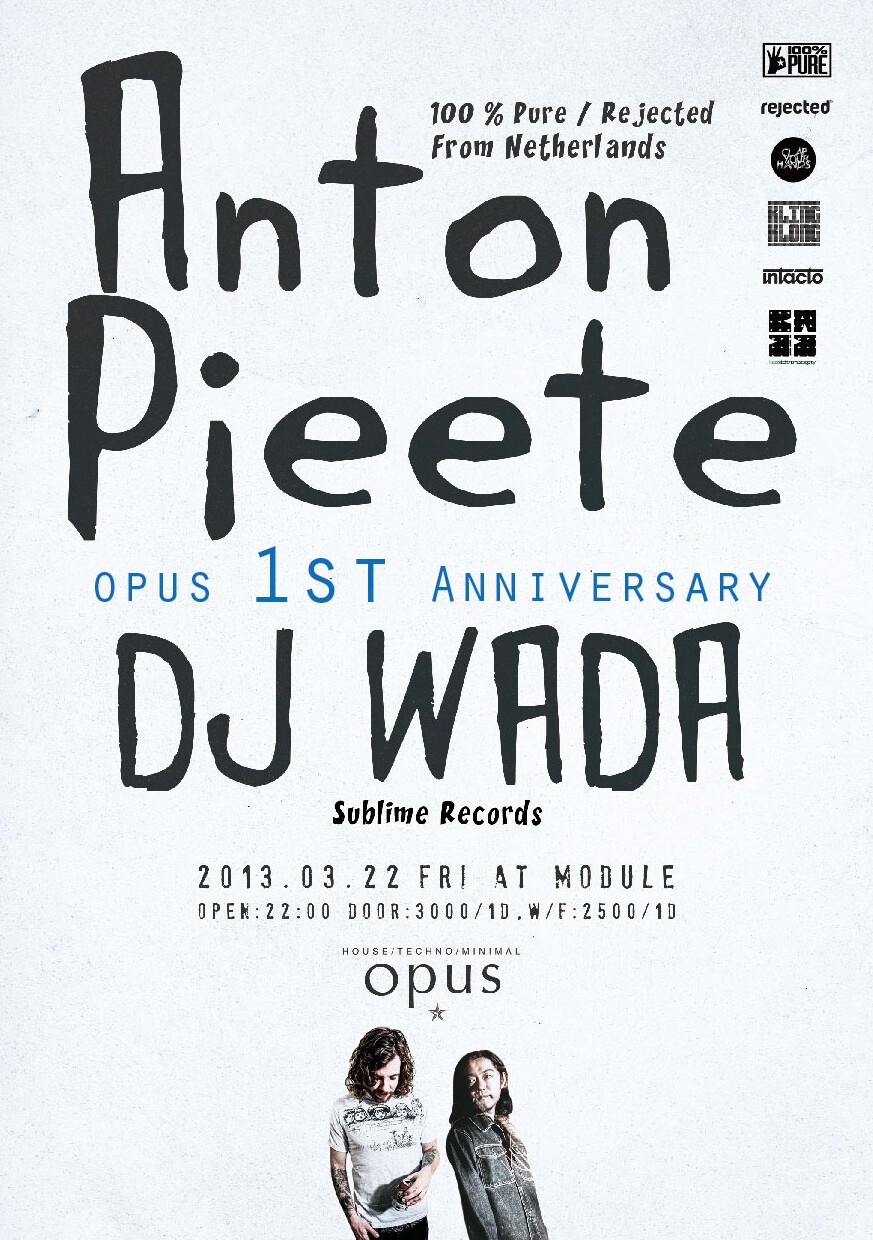 昨年から始動し、数多くにアーティストを招致してきたopus(オプス)が1周年を迎える。今回のスペシャルゲストは100 % PureやBart SkilsとのユニットのDistrict Oneで活躍している次世代ニュースクールテクノアーティストのAnton Pieeteをオランダから迎える。そして、DJキャリア30年にCo-Fusionとして活躍してきたDJ WADAをゲストに迎えアニバーサリーを盛大に迎える。両頭共に数多くのファンを魅了し続けているアーティストなだけにとても楽しみな共演である。アニバーサリーにふさわしいこの日限りのスペシャルな一夜を体感してください。