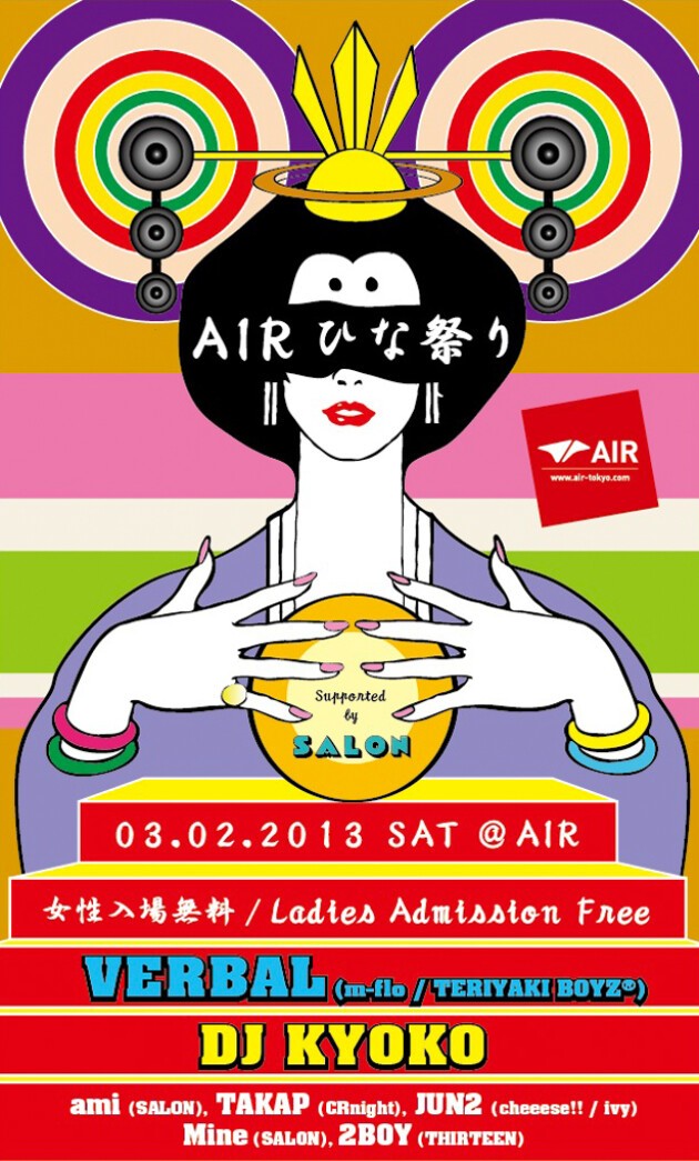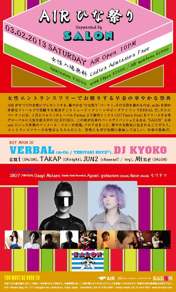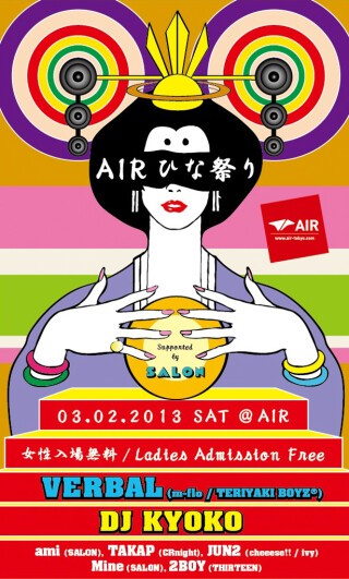 AIRがすべての女性にプレゼントする、賑やかな“ひな祭り”パーティ。その主役を務めるのは、m-floを初め多彩なフィールドで活躍する東京ダンスミュージックシーンのビッグアイコンVERBALだ。さらにパーティには、1月にベルリンのレーベルFarbenより新作ミックスCD「Time's Fool」をリリースする等グローバルに人気を拡大中のDJ KYOKO、この夜が自身のバースデイバッシュともなる“SALON”主宰amiといった多数のフィメール・クルーが登場。フロアはきっと、華やかな熱気に包まれることだろう。エントランスフリーの女性はもちろんのこと、男性にもぜひ気軽に参加してほしい、早春の祭典だ。