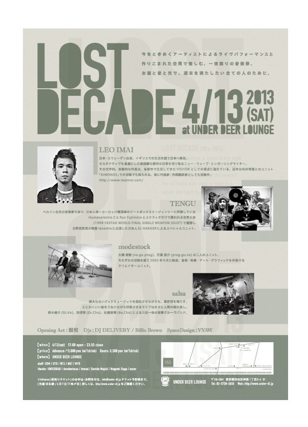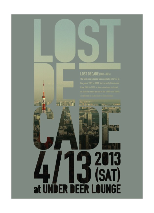 「今」が旬のアーティスト達によるパフォーマンスと、作りこまれた空間で愉しむ、 "Lost Decade"(90's~00's)をテーマにした、一夜限りの音楽祭。 週末を音と光で満たしたい全ての人のために。