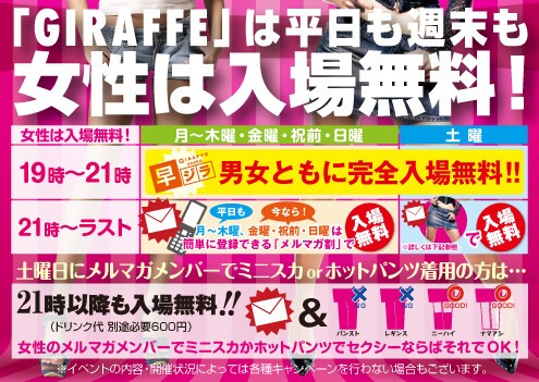 ジラフの土曜日は、メルマガメンバー+ミニスカorホットパンツ着用の女性は