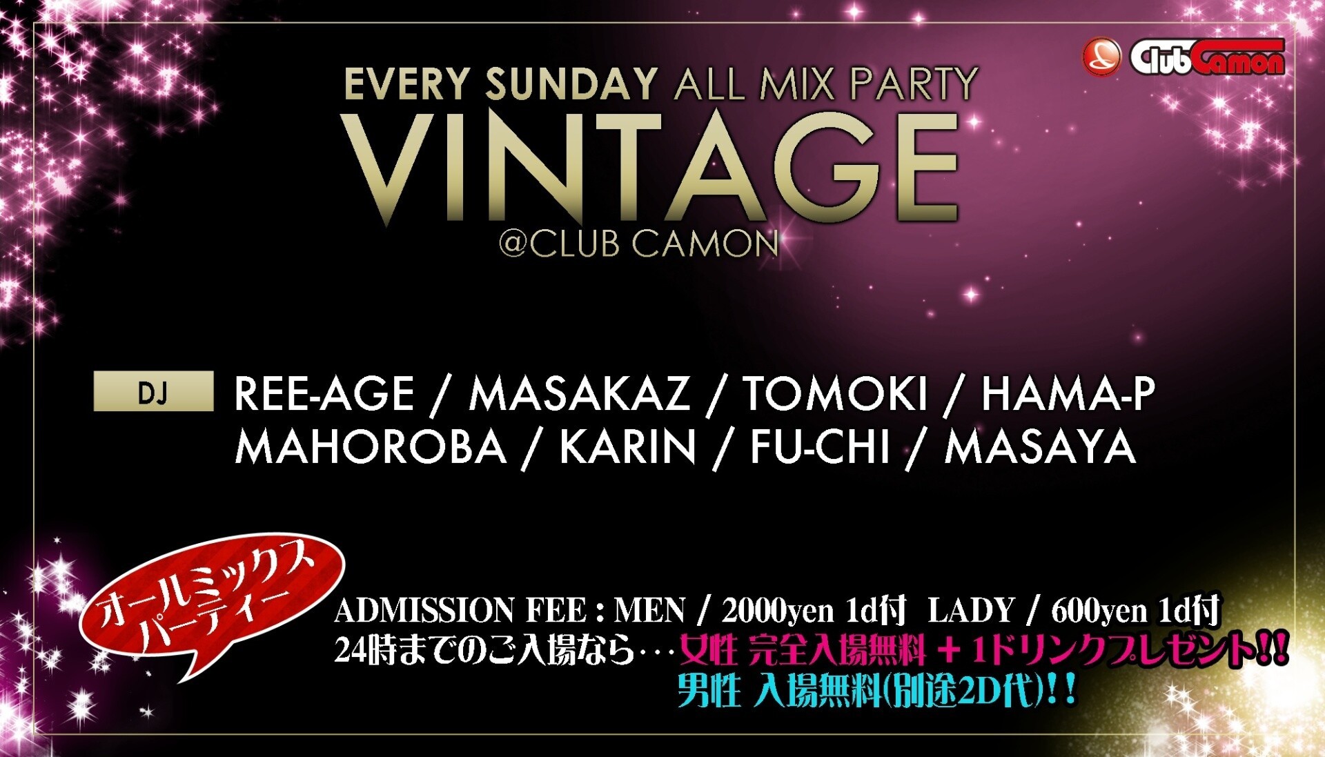 【毎週日曜オールジャンル】話題沸騰!!日曜カモンは毎週大盛況のオールミックスパーティー『VINTAGE』☆☆24時まで男女入場無料&女性は1Dプレゼント★★24時以降もmixi割で超お得♪