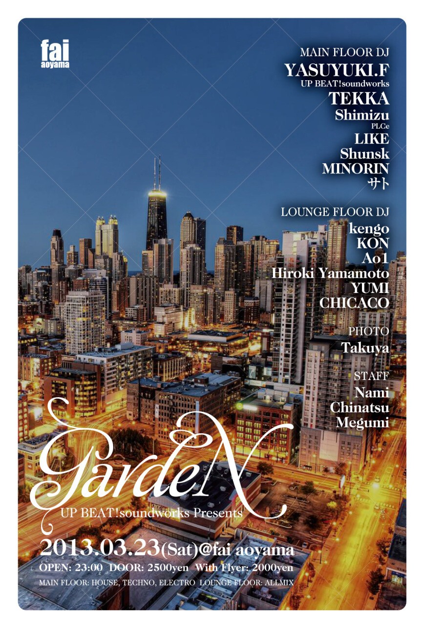 UP BEAT!soundworks Presents“GARDEN”が南青山の老舗お洒落クラブfai aoyamaで2回目の開催を迎える!!!