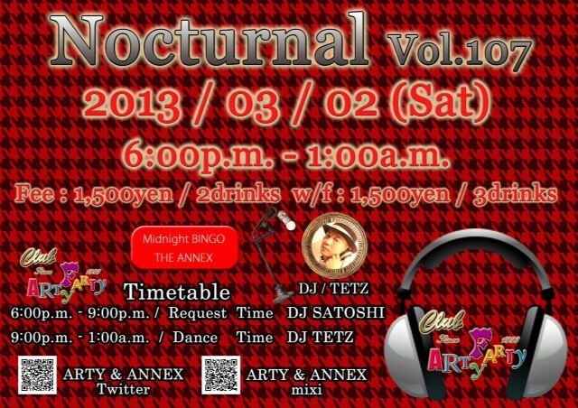 Arty Farty is the bar responses to your request of songs to be played for all admission free every night. But once a month they have a paid party called "Nocturnal" to invite professional leading DJs who has the advanced technique and characteristic style to play high quality music aspired by the crowd of Arty Farty.