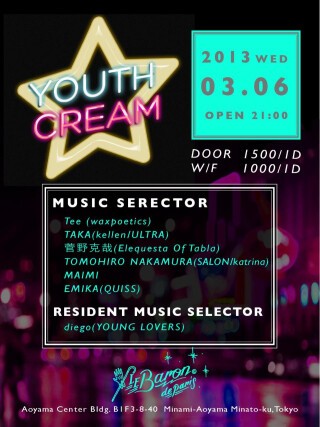 ネクストジェネレーションのDJ陣が集結するYOUTHCREAM第3弾!wax poeticsのTeeとkellenのTAKAといった個性溢れる新進気鋭の若手DJが豪華共演。週末に向け、パーティーモード全開の水曜日で今週をスタートしよう。