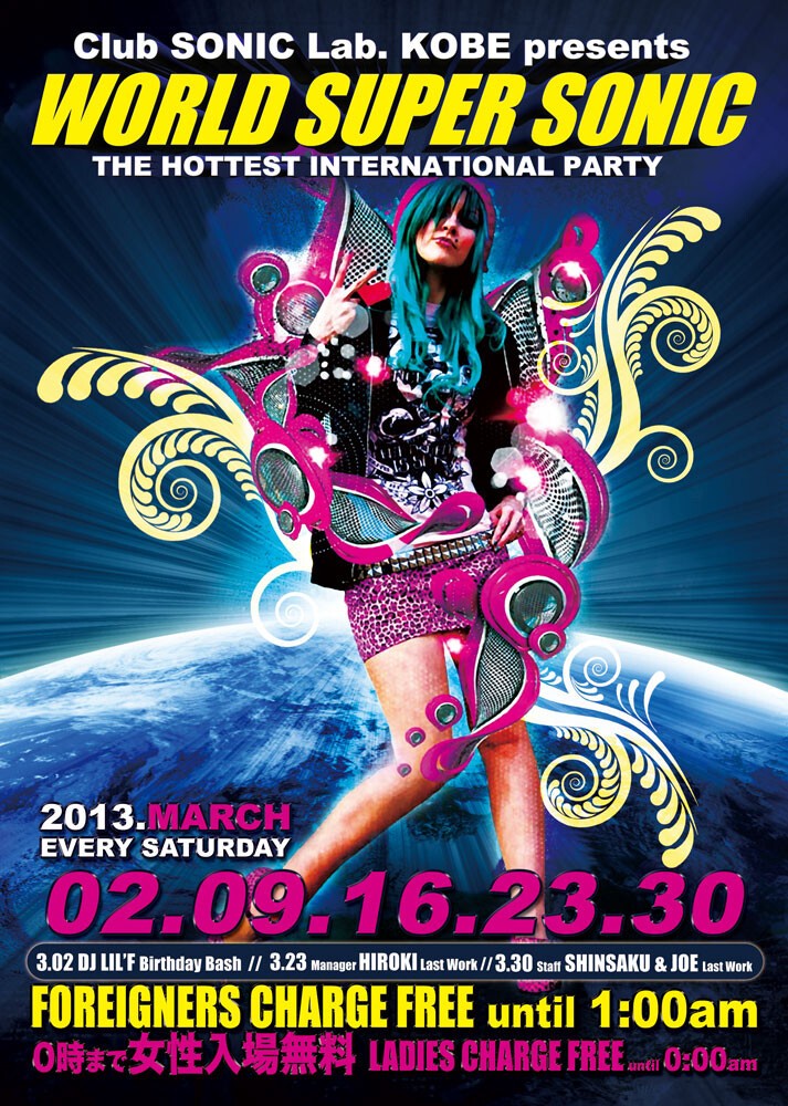 World Super SONICは神戸で1番HOTな INTERNATIONAL PARTYを目指し、外人さんと共に国境を越えた異文化交流も含め、様々なスタイルでお客さんに楽しんで・騒いでもらうことを第1に考えてDJがPLAY♪♪