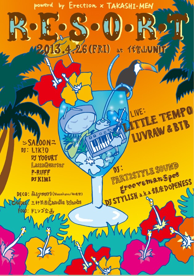 日本を代表するインストゥルメンタル・ダブ・バンド、リトルテンポ そして、from ヨコハマ、Pan Pacific PlayaからツインTalk Box デュオ LUVRAW & BTB、LatinQuarter、国内のみならず海外のシーンにも影響を与え続ける最先端なスタイルの PART2STYLE SOUND、様々なジャンルの音楽性を交錯させた選曲で毎週のように日本各地でDJをおこなっているDJ YOGURT、世界が注目する新鋭ビートメイカー/プロデューサー/DJのgroovemanSpot、ブルージーかつフリーキーな唄心をあわせ持つ異才MC 鎮座DOPENESS、クラブDJとしての『司祭性』とターンテーブリストとしての『実験性』を独自の文脈で融合させる異才L?K?Oらが出演。 一晩限りの極上のR・E・S・O・R・T を是非お楽しみに。