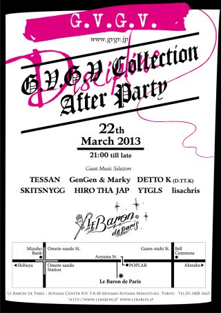 ジャパンファッションウィーク終盤の3月22日は、東京を代表するG.V.G.V.のコレクションアフターパーティーを開催!ゲストミュージックセレクターには新進気鋭のDJから東京のパーティーシーンを盛り上げるカリスマDJなど、フルラインナップな顔ぶれ!Le Baron流ファッションフォワードなパーティーをお見逃しなく!