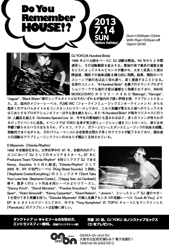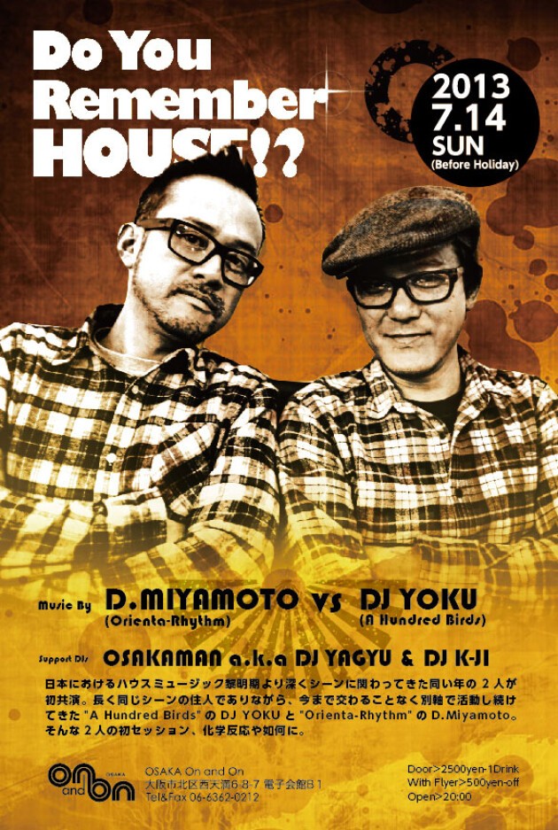 ハウスミュージックは人を踊らせることだけに特化した、この世の中のありとあらゆる音楽ジャンル、音源の融合体であろう。テクノやトランスをはじめとする後に世界中を席巻する事となる様々なダンスミュージックスタイルがここから派生しようとも、ハウスミュージックは常に本流の威厳と誇りを保ち、廃れること無く、ダンスミュージックの主軸として君臨し続けている。ハウスミュージックはその誕生から今日に至るまで、多くの人間を魅了し、虜にし、刺激を与え続けてきたことは間違いない。近年、日本におけるハウスミュージックパーティーは以前に増して海外の著名DJを招聘して開催されるケースが多い。実際、ある程度のクオリティーが担保されるのだから、当然と言えば当然であろう。しかしそんな中、あえて日本人DJによる、本気のハウスミュージックパーティーを企画してみた。"A Hundred Birds"のDJ YOKUと"Orienta-Rhythm"のDaisuke Miyamoto。関西はもとより、日本におけるハウスミュージック黎明期より深くシーンに関わってきたこの2人。後に日本のみならず、世界的にその名を知らしめることとなり、ハウスミュージックファンなら誰でもよく知る存在である。共に1968年生まれの今年45歳。共に深くハウスミュージックを愛し、共に20年以上のDJキャリアを有する。年齢だけでなく、意外に共通点が多い2人。にも関わらず、これまで一度もその活動が交わることがなかった2人。この2人が共演したら一体どのような化学反応が起こるのであろうか?やってみるしかない。