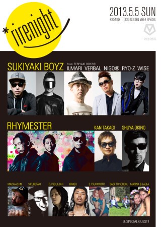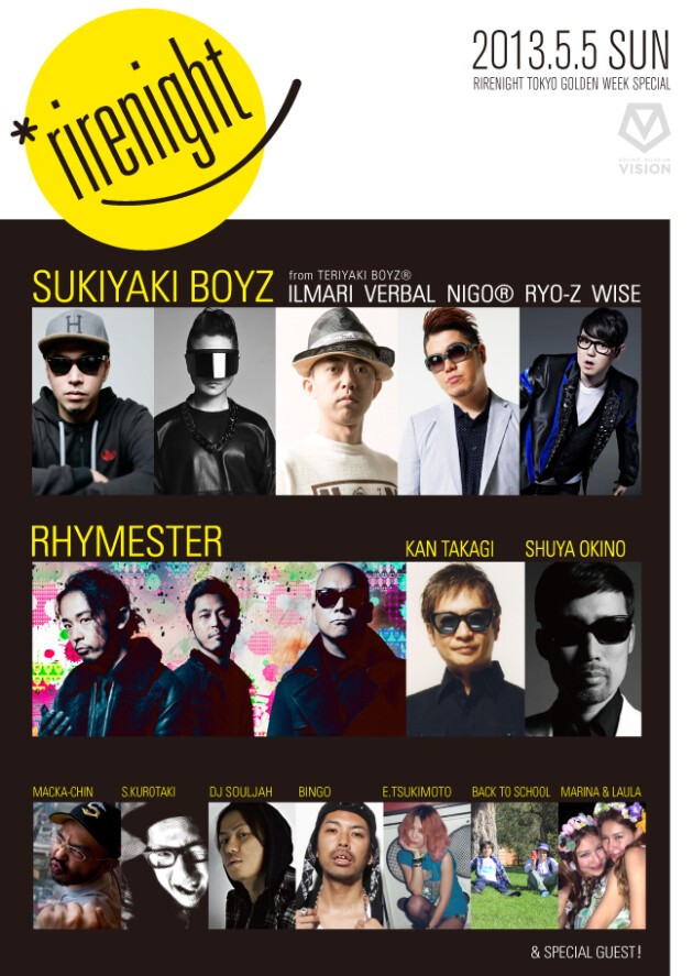 数々の素晴らしい瞬間を創り出してきたであろうVISIONの黄金週間も、いよいよファイナル。2年連続でクライマックスを飾るのは、東京カルチャーシーンの象徴といえるブログコミュニティサイトrirelogがプロデュースする“rirenight”だ。メインアクトには、TERIYAKI BOYZ® のDJユニット名義であるSUKIYAKI BOYZがフルメンバーで登場。さらに、rirelogの張り巡らせた幅広いネットワークから、数多くの魅力的アーティストたちが続々と参戦する予定だ。昨年は、並みいる海外ビッグネームのパーティを抑え、GW最高動員を記録した“rirenight”。今年は、どんな伝説を打ち立てるのだろうか。