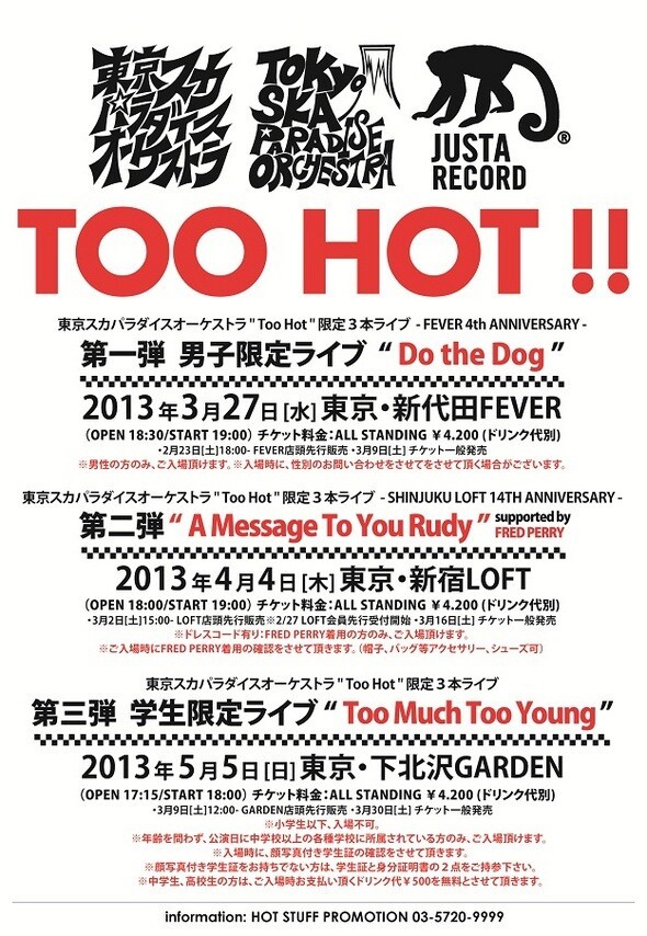 アメリカ最大フェスティバル"Coachella Music Festival 2013"の出演など、世界を股にかけて活動する東京スカパラダイスオーケストラが都内ライブハウスで"制限"付きのライブを行うことが決定した。