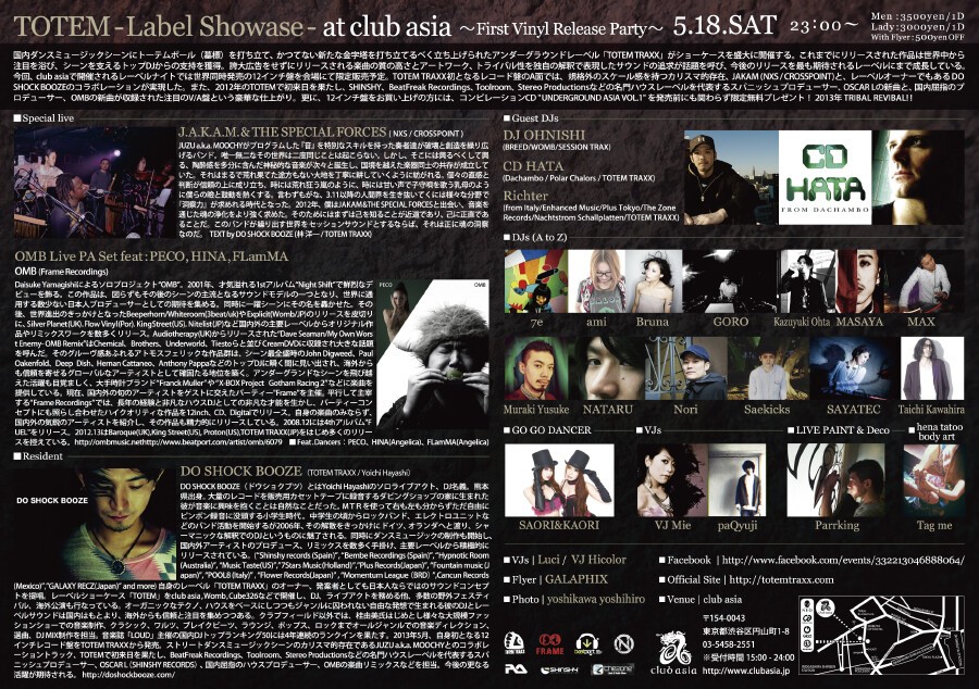 都内の有名クラブを中心にサーキット形式で開催されるオフィシャルアフターパーティーの中、国内のハウスミュージックレーベル「TOTEM」が今年17周年を迎えたばかりの老舗、clubasiaでコラボレーション開催決定。豪華出演者と共に忘れられない熱い一夜を体験して欲しい。