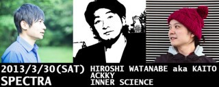 Kaito4作目となるアルバムのリリースも待たれるHiroshi Watanabe、サイケポップバンドLove Me Tenderではサックス奏者としても活躍したackky、4月には2年振りの12インチ「Silent Awaking e.p.」のリリースが予定されているINNER SCIENCEの三者による色彩豊かな音世界。