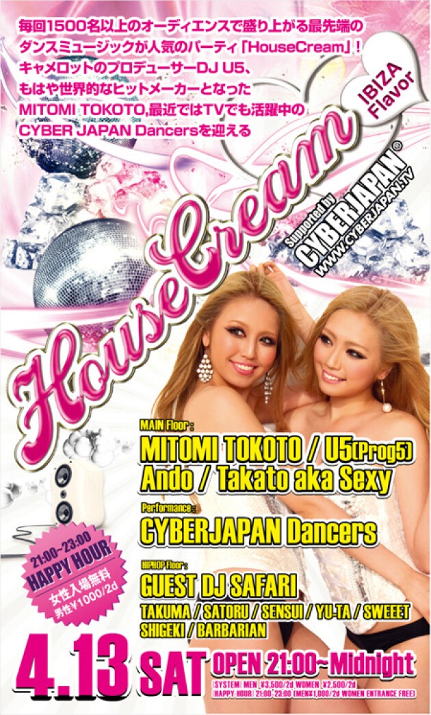 HAPPY HOUR 21:00~23:00(MEN¥1000/2d WOMEN ENTRANCE FREE)