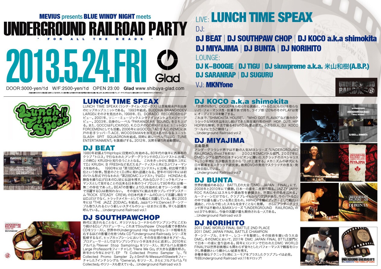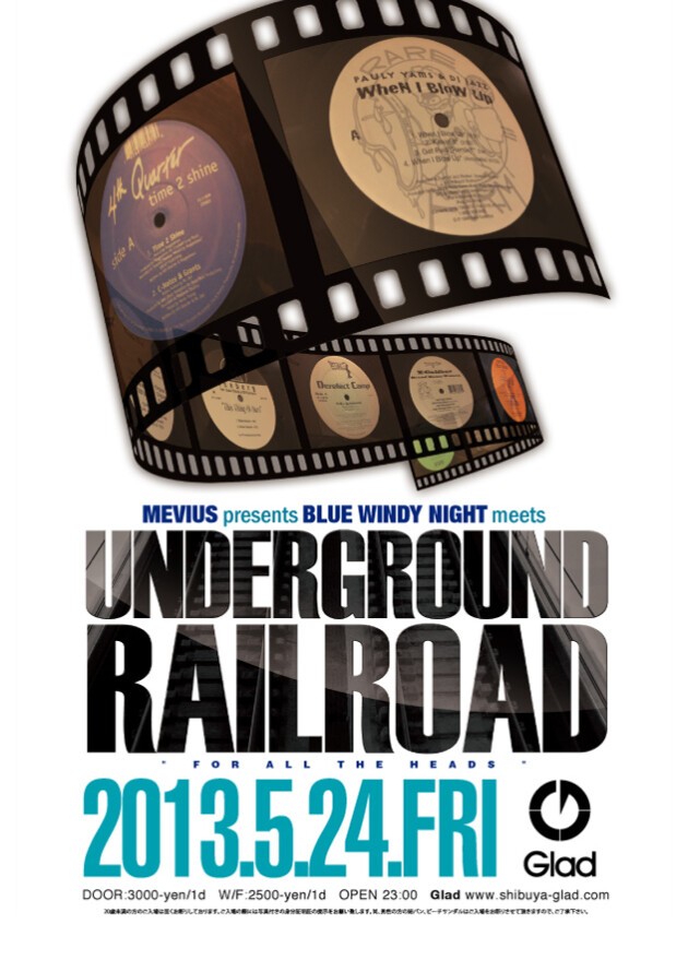 今年、一発目のMEVIUS presents BLUE WINDY NIGHT!今回はUNDERGROUND RAILROADとのコラボが実現。このMIXシリーズが発表されると、中古レコード市場が一変すると言われるDIGGERにはお馴染みのUNDERGROUND RAILROAD。ついにオフィシャルで開催されるということで、豪華出演者が揃い踏み!シリーズを彩った、DJ BEAT,DJ KOCO a.k.a shimokita,DJ BUNTA,DJ MIYAJIMAらが参加。そしてLIVEにはLUNCH TIME SPEAXが登場。これ以上ない黒い音を聴ける一夜は今宵限り。語り継がれること間違いないこのパーティーを見逃してはならない。