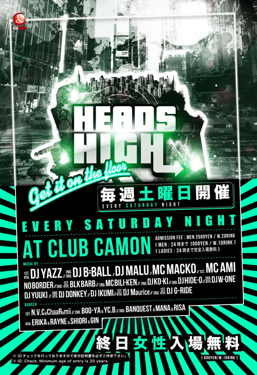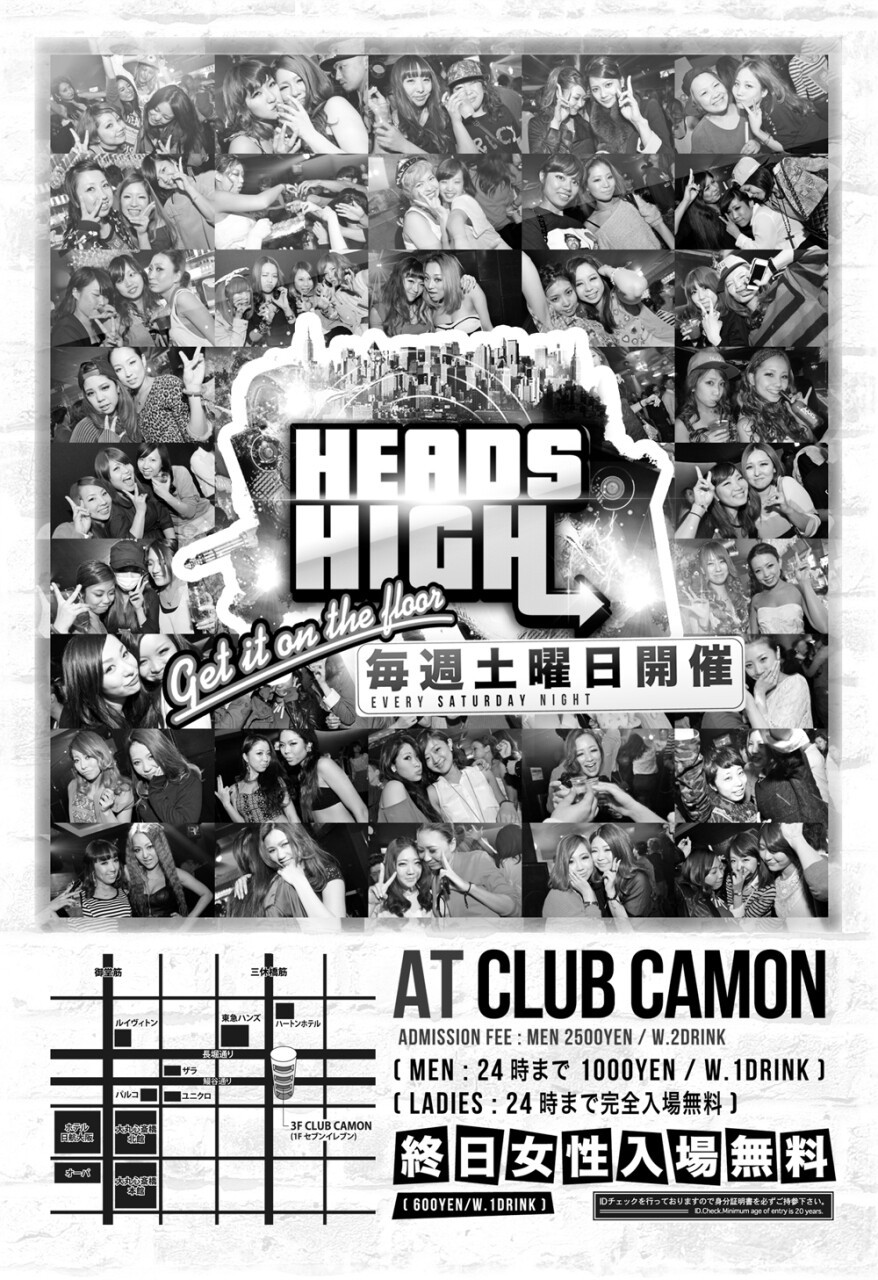 毎週土曜カモンは関西を代表するアーティストによるビッグパーティー『HEADS HIGH』♪関西を代表する超豪華なDJ陣が毎週ローテーションで登場!!ジャンルは幅広い選曲で最初から最後まで楽しめます☆HIP HOP, R&B, REGGAE, ELECTRO, TOP40など♪土曜でも女性は終日入場無料なので安心して遊びに来て下さい★★