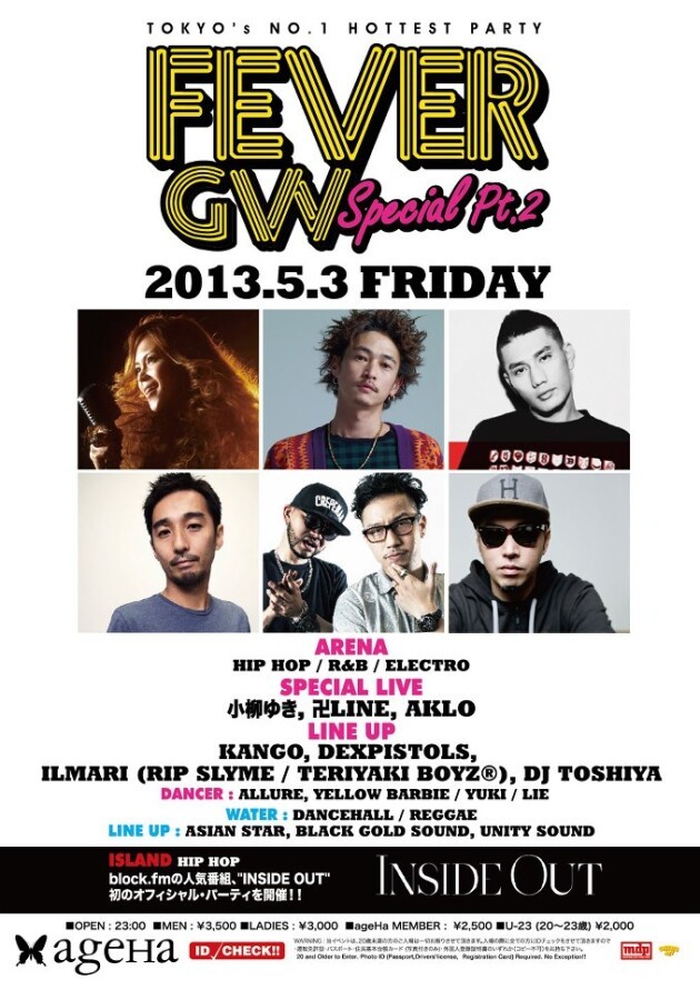 FEVERのゴールデンウィークスペシャル第2弾はゴールデンウィーク真っただ中に開催! メインフロアのARENAでは、4月末に待望のニューシングルをリリースする小柳ゆき、リリックに込めた熱いメッセージが多くの人を惹き付ける卍LINE、アルバムが高い評価を得た大注目の新世代ラッパーAKLOがライブ。そして、KANGO、DEXPISTOLS、ILMARI(RIP SLYME)、DJ TOSHIYAといった蒼々たるメンツが、HIP HOP、ELECTROを中心にDJプレイ。屋外のWATERは、ASIAN STAR、BLACK GOLD SOUND, UNITY SOUNDがDANCEHALL/ REGGAEを中心にプールサイドのヴァイブスを全開に。ISLANDは、block.fmの人気番組、"INSIDE OUT"初のオフィシャル・パーティを開催。ベテランDJ KEN-BOから若手DJまで、他ではなかなか聴けない最新HIP HOPにフォーカスしたプレイでフロアをロック。番組ホストの3人ももちろん参戦です。