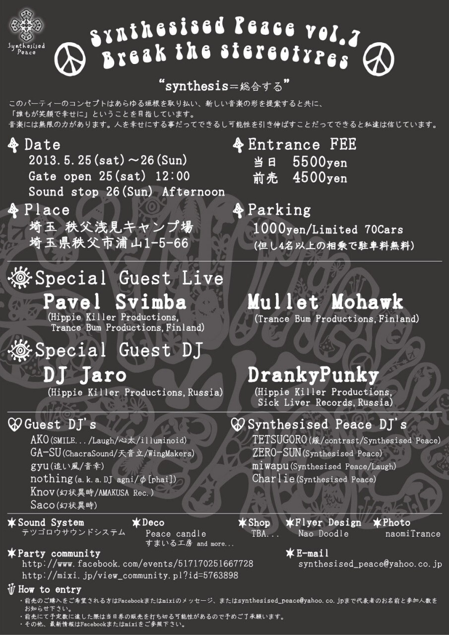 ・前売のご購入をご希望される方はFacebookまたはmixiのメッセージ、またはsynthesised_peace@yahoo.co.jpまで代表者のお名前と参加人数をお知らせ下さい。