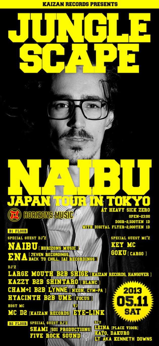 2013 年JUNGLE SCAPE第二回目のゲストは先日Fall EPをリリースし、Laurent Garnier,Paradox,Ulrich Schnaussなどの大御所からのサポート、更にはDJ MagやMixmagなどからも大きな評価を得るフランスからNAIBU、そして今の東京アンダーグラウンドベースミュージックシーンの象徴とも言え、4月に7even Recordingsからアルバム"BILATERAL"がリリースされた、ENAがスペシャルゲスト!今回はNAIBUのジャパンツアーと題し東京、大阪の二公演。