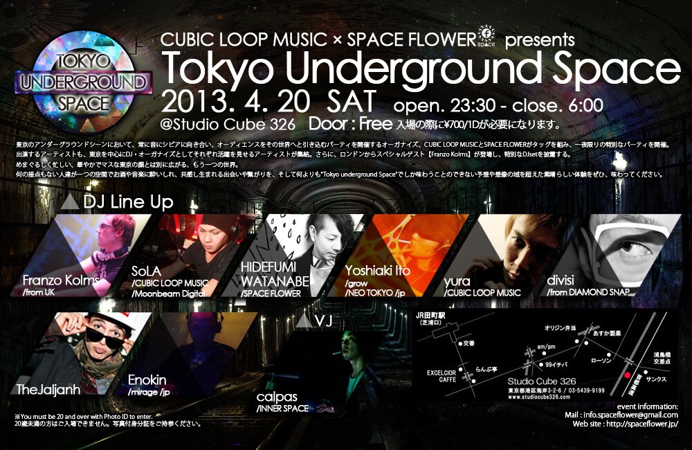 東京のアンダーグラウンドシーンにおいて、常に音にシビアに向き合い、オーディエンスをその世界へと引き込むパーティを開催するオーガナイズ、CUBIC LOOP MUSICとSPACE FLOWERがタッグを組み、一夜限りの特別なパーティを開催。